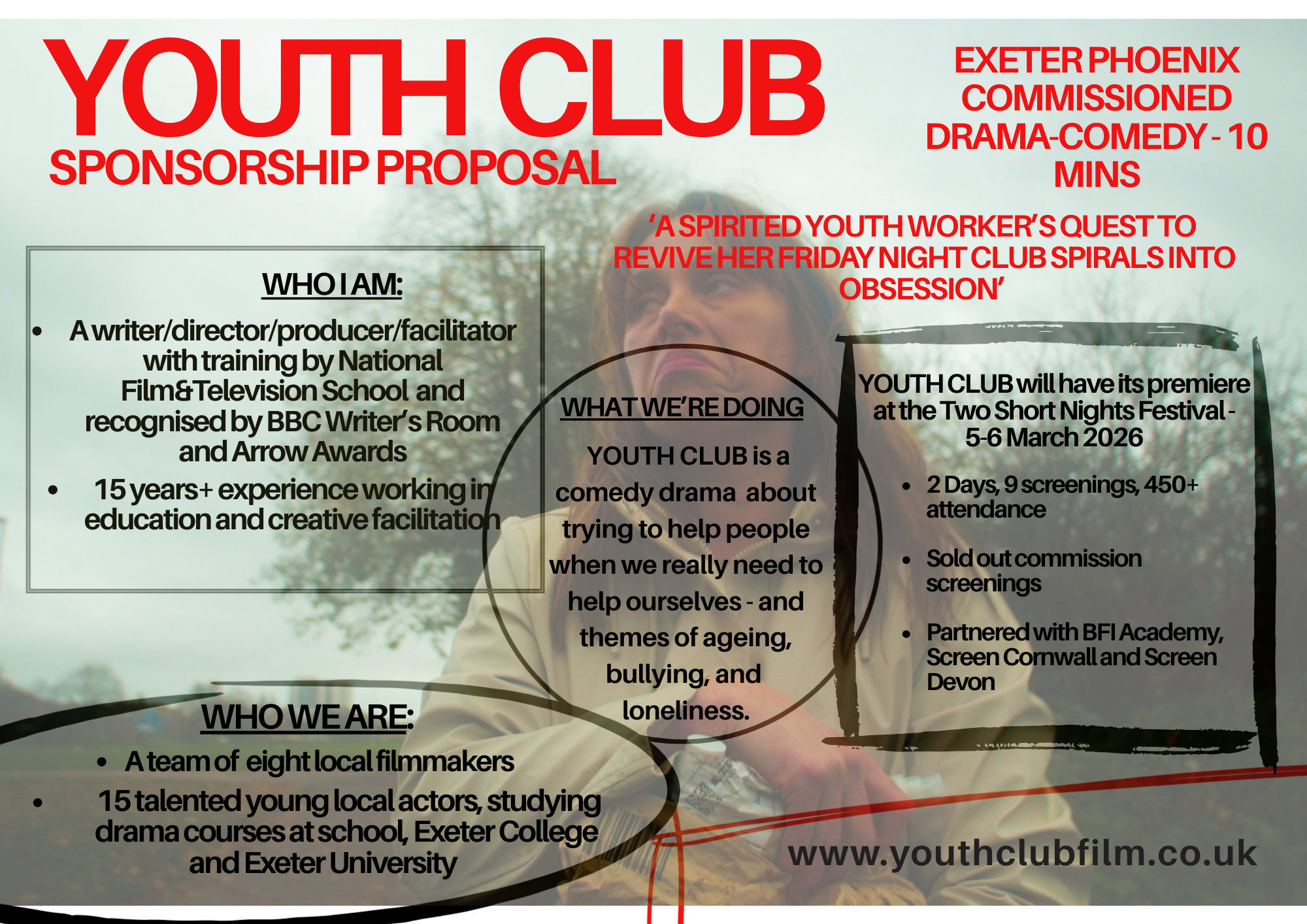 YOUTH CLUB WAS COMMISSIONED BY EXETER PHOENIX IN MAY 2025 AND WILL BE PREMIERED AT THE TWO SHORT NIGHTS FESTIVAL IN MARCH 2026.