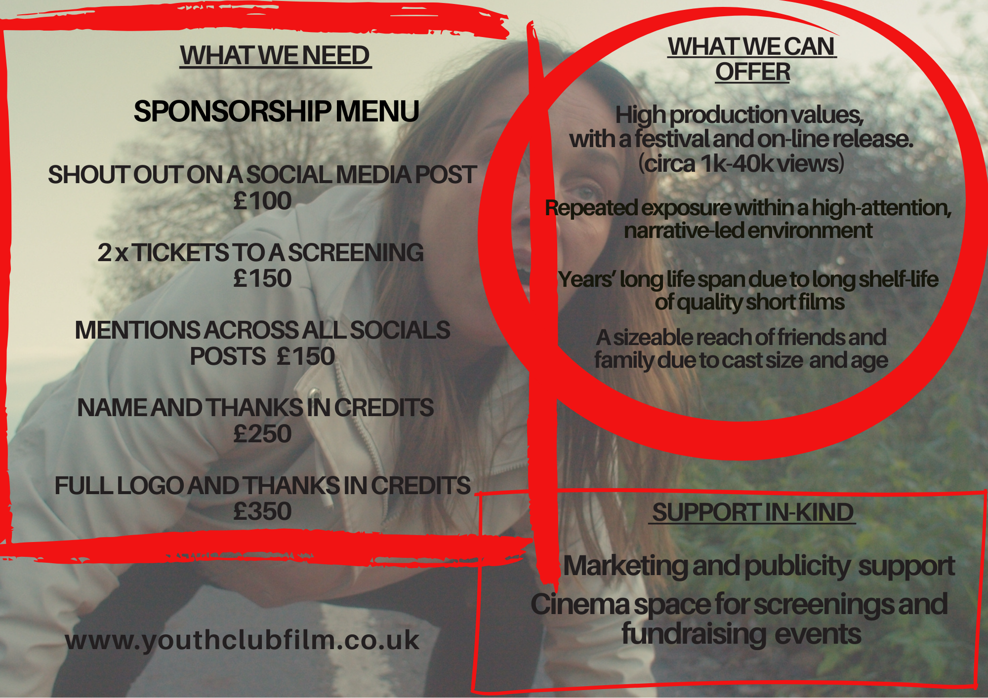 YOUTH CLUB IS AN EXTREMELY AMBITIOUS PROJECT. WE HAVE INVOLVED 14 YOUNG ACTORS,TEN (MAINLY OUTDOORS) LOCATIONS, AND AN UNTRAINED LEAD ACTRESS.